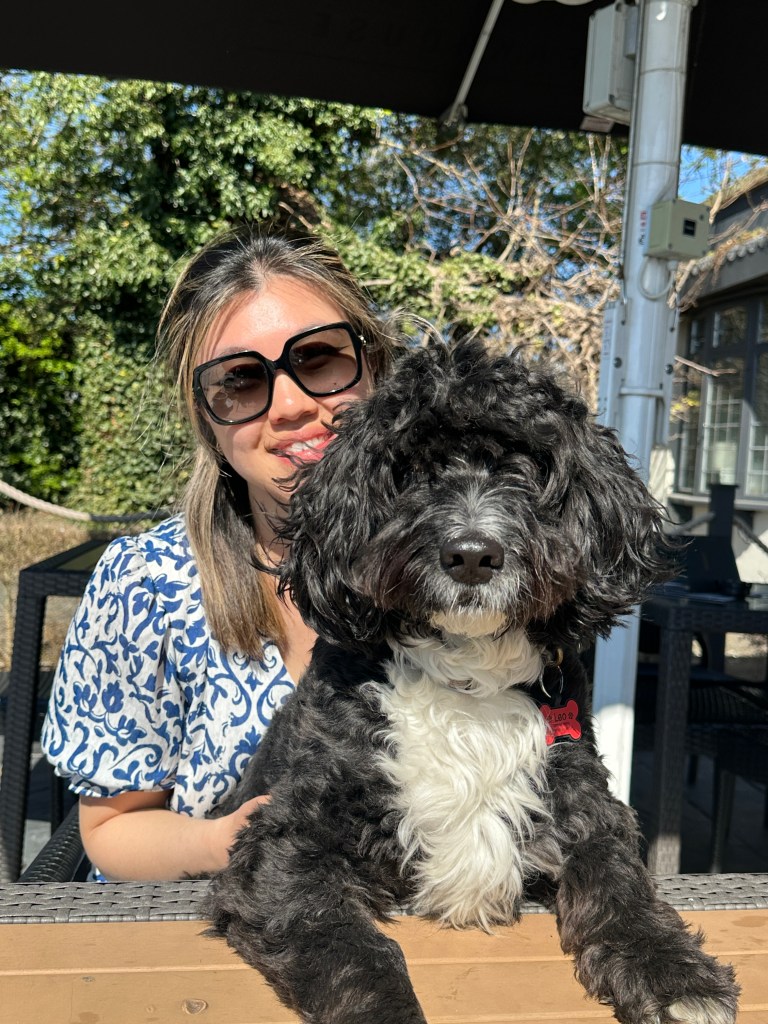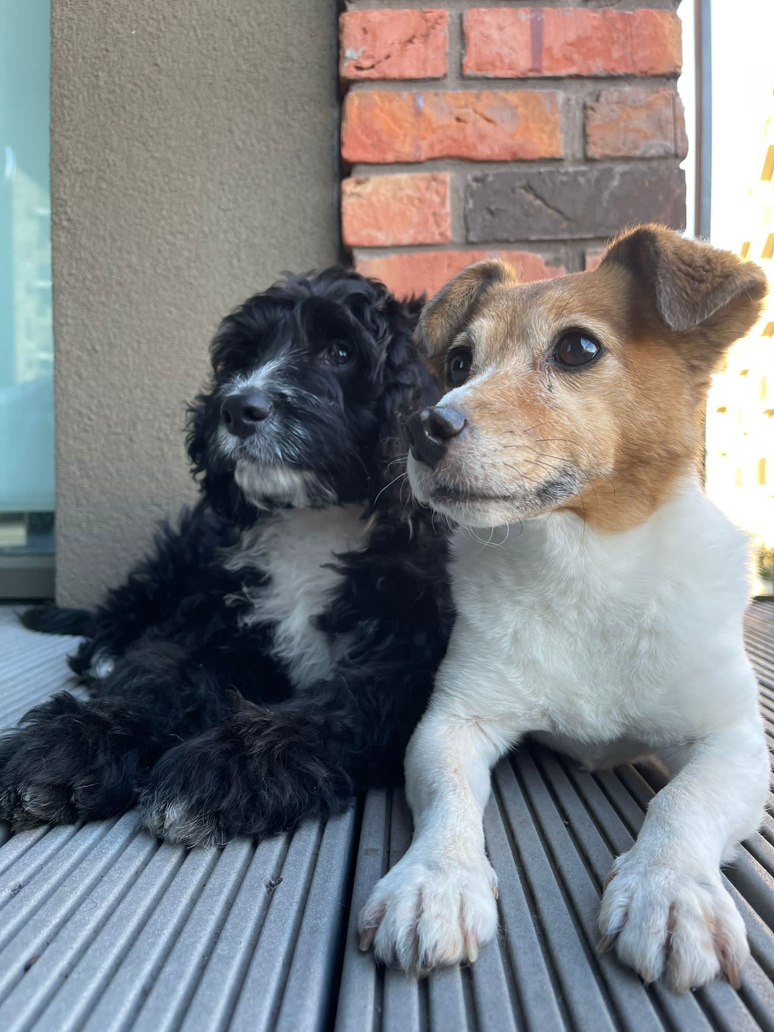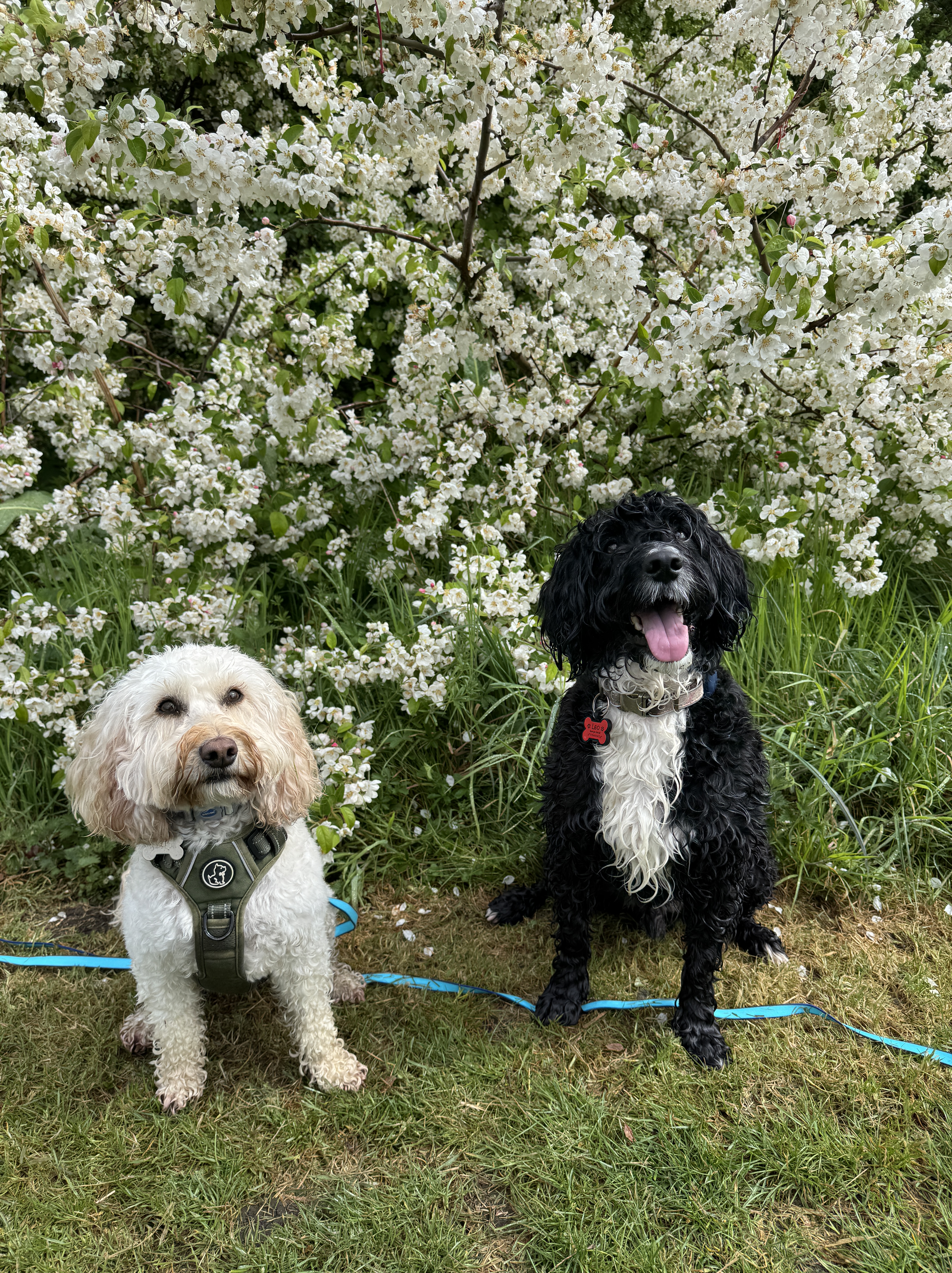I am Esztella and the handsome little boy next to me is Leo, my high-energy, almost 4-year-old Springapoo.